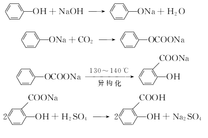 將酚與50%氫氧化鈉按1:1.02(mol)配比加入反應(yīng)器中進(jìn)行反應(yīng)脫水,控制游離堿≤1%,減壓脫水后,再加酚作溶劑共沸脫水。然后將酚鈉在酚中通入干燥的二氧化碳?xì)怏w,進(jìn)行羧化反應(yīng)3h后,第二次通入二氧化碳2h,再減壓回收酚,即羧化完畢。再向上述水楊酸鈉溶液中,加入水溶解成50%的溶液,在攪拌下加入7%-8%的酸化至ph值1-2,然后冷卻過(guò)濾,真空干燥,即得水楊酸粗品,再將粗品在減壓下升華,可得含量為99%的成品水楊酸,收率50%-70%。(2)中壓法 仍以酚為原料,先制成酚鈉,在中壓下用二氧化碳進(jìn)行羧基化,生成碳酸酚酯,然后加壓進(jìn)行分子重排,生成水楊酸鈉,再經(jīng)酸化后處理制得水楊酸。