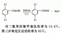 2.氯甲基化法由對二氯與多聚甲醛作用,再經高錳酸鉀氧化而得。對二氯的氯甲基化收率為53.4%,第三步氧化反應的收率為83%