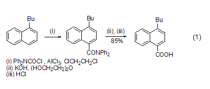 羧基的引入 在alcl3催化下,dpc-cl 可在芳環(huán)上引入一個羧基。烷基或烷氧基取代的芳環(huán)容易發(fā)生反應。產(chǎn)物二基酰胺用堿水解,再酸化可得到羧酸 (式1)[1]。