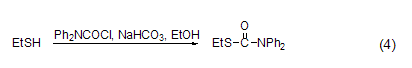 與巰基的反應 在堿性條件下 (如nahco3),在溶液中dpc-cl可與硫醇反應 (式4)[8]。